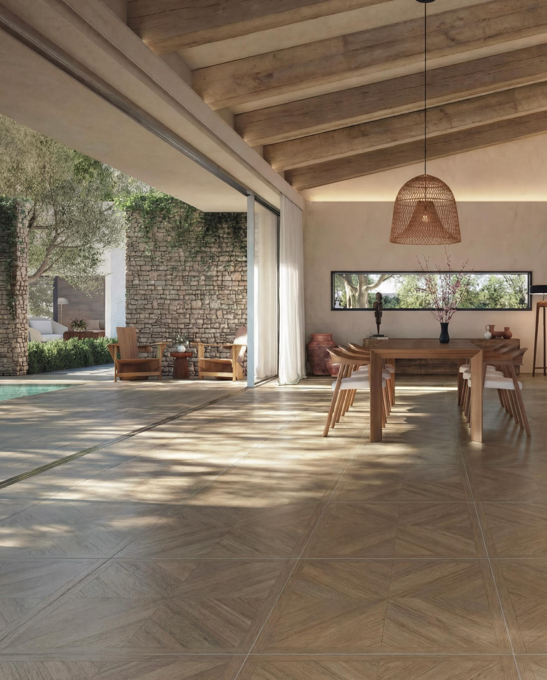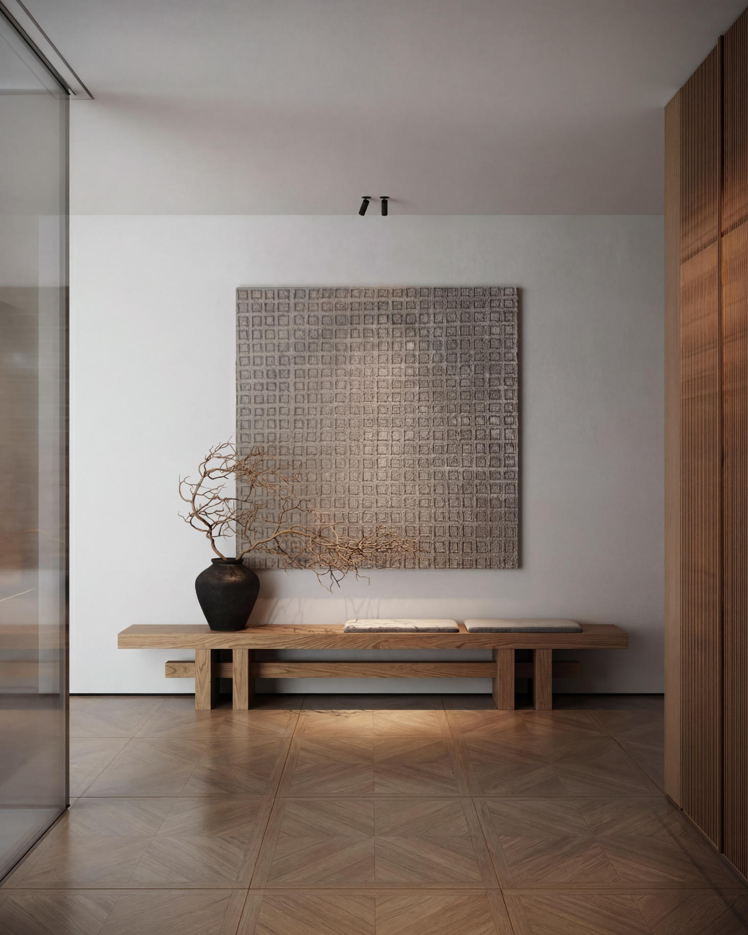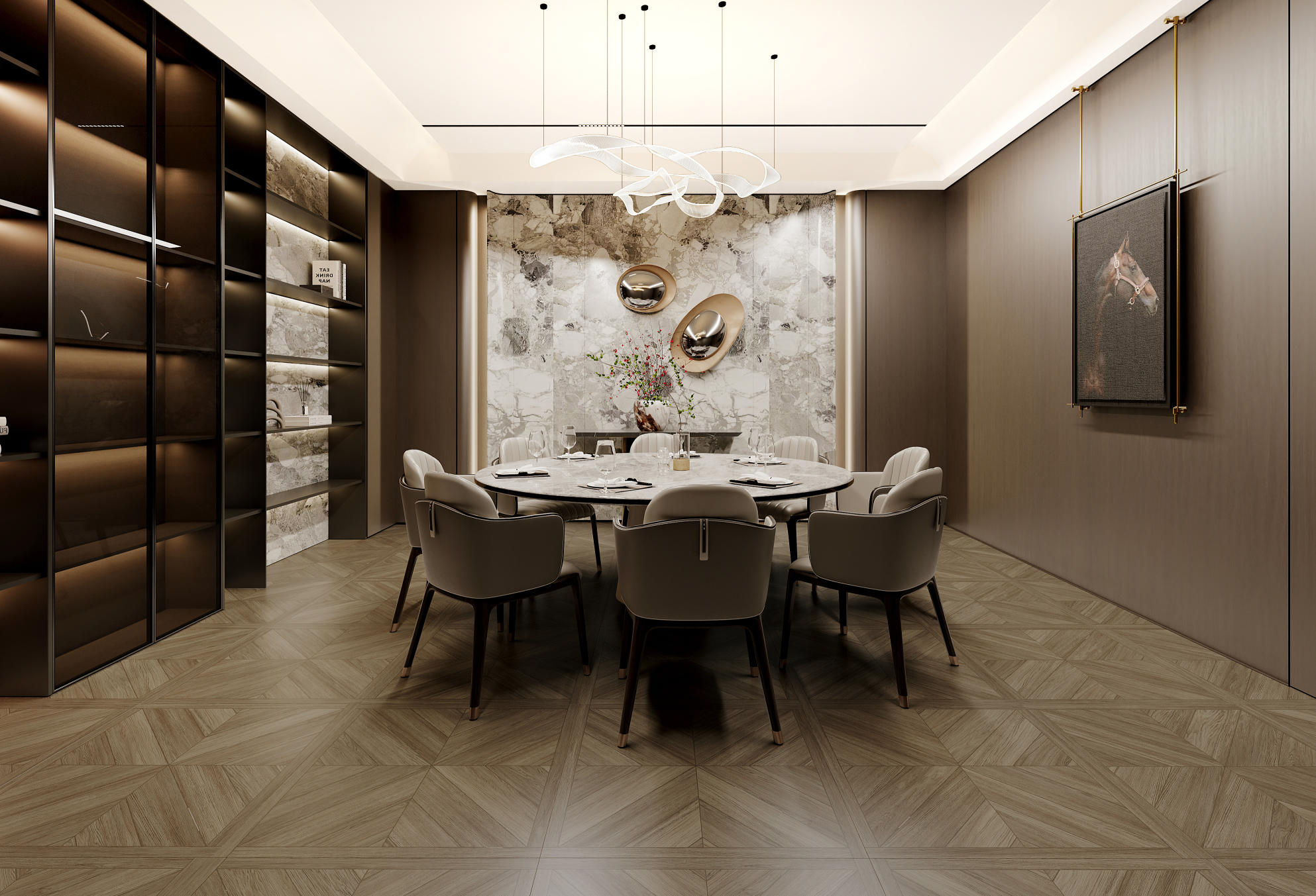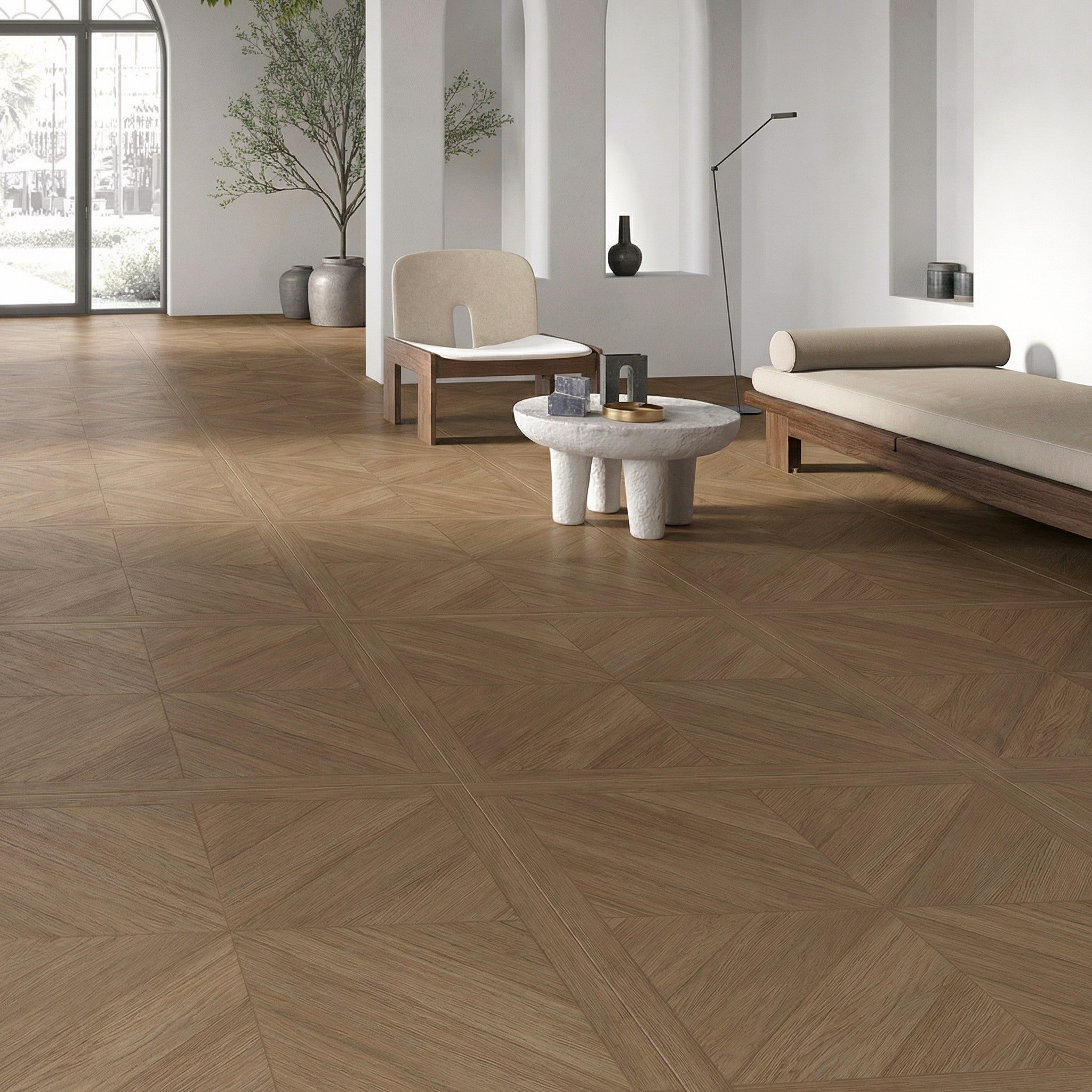 秋棠菱歌米字紋理如葉脈般舒展,在視覺上消解了空間的邊界感,卻又以利落的線條勾勒出層次。像給空間鋪了一層會呼吸的柔光,襯出溫潤的松弛感。
